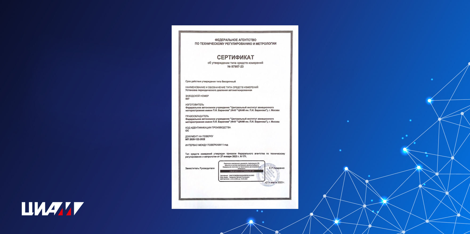 Разработанная в Центральном институте авиационного моторостроения имени П.И. Баранова (ЦИАМ, входит в НИЦ «Институт имени Н.Е. Жуковского») автоматизированная установка периодического давления «Пульсатор» получила сертификат об утверждении типа средств измерений. Установка будет применяться в качестве рабочего эталона для проверки и калибровки измерительных каналов и позволит повысить точность измерений. Ее особенность заключается в возможности вычислять характеристики измерительного канала на предмет такого важного параметра, как периодическое давление или «пульсации». Сложность в том, что данный параметр не всегда можно измерить прямым способом, установив датчик непосредственно на объект. Например, в условиях высоких температур он просто сгорит. Установка же позволит получать необходимые данные даже в условиях удаленного расположения датчика от точки отбора. – Потенциал использования «Пульсатора» для получения характеристик в измерительных каналах очень широк – это в том числе и технологические узлы испытательных стендов, например, такие как трубопроводы и барокамеры, – поясняет начальник отделения-заместитель главного метролога ЦИАМ. – Как правило, при испытаниях на всех стендах без исключения объекты испытаний снабжены такими каналами измерений. «Пульсатор» повышает достоверность получаемых данных о переменных давлениях, тем самым и информативность испытаний. Получению сертификата типа на установку предшествовала большая работа. Готовые материалы были представлены во Всероссийский научно-исследовательский институт метрологии имени Д.И. Менделеева, который провел ее испытания. Выполненные проверки в целях утверждения типа в полном объеме подтвердили соответствие установки обязательным метрологическим требованиям к рабочим эталонам, установленным государственной поверочной схемой ГОСТ Р 8.801-2012. Затем результаты испытаний прошли предусмотренную регламентом проверку в едином центре проверки результатов испытаний Росстандарта (ФГУП «ВНИИМС»). В соответствии с заключением «Пульсатор» отвечает обязательным метрологическим требованиям к рабочим эталонам, установленным государственной поверочной схемой. Поверочная установка каналов переменных давлений «Пульсатор» разработана научным коллективом экспериментаторов ЦИАМ. Специалисты проделали большой комплекс работ: были автоматизированы технологические процессы, разработана методика калибровки измерительных каналов, получены поправочные коэффициенты приведения уровней измеренных сигналов, разработаны рекомендации по выбору геометрических параметров и материала волноводов для датчиков давления с диаметром мембран от 1 до 14 мм, определены оптимальные варианты подключения датчиков и многое другое. – Установка определяет амплитудо- и фазочастотные характеристики измерительных каналов переменного давления в зонах действия высоких температур. Это позволит повысить точность измерения при исследовании узлов авиационных двигателей (компрессоры высокого давления, камеры сгорания и т.д.) и других высокотехнологичных объектов. Нет сомнений, что подобных установок, тем более утвержденного типа, нет ни в КБ отрасли, ни у производителей датчиков. При этом есть огромный интерес, – говорит начальник отделения-заместитель главного м